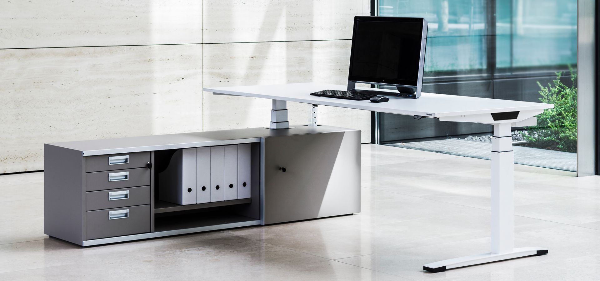 Ein elektrisch höhenverstellbarer Schreibtisch löst dieses Problem, weil er sich an Sie anpasst. Mit einem Knopfdruck wechseln Sie zwischen Sitzen und Stehen.